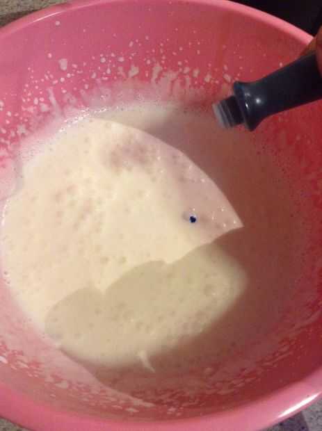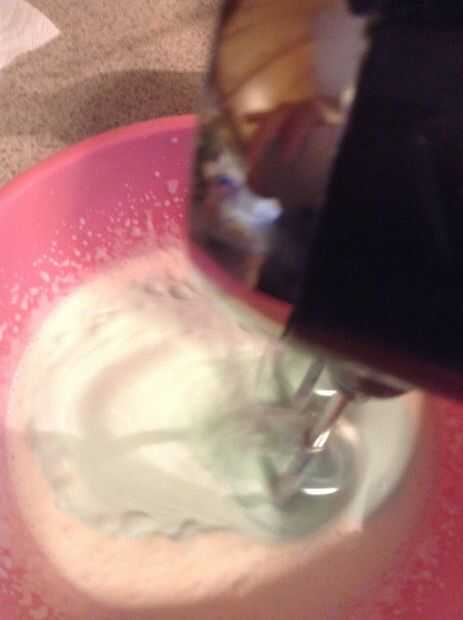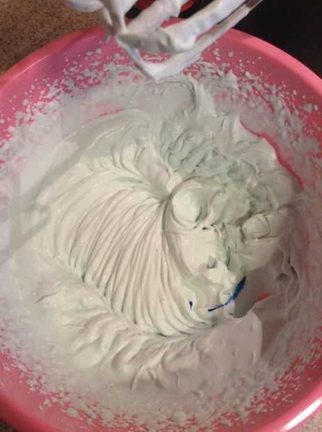 Agregar colorante azul para parecerse a un color azul cielo. Usando una batidora eléctrica, mezclar en un medio de alta velocidad. Añadir más colorante si lo deseas tu baño para ser un poco más oscuro.