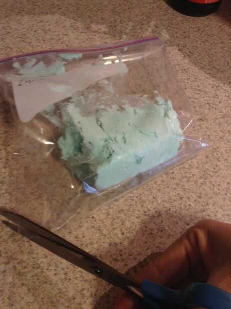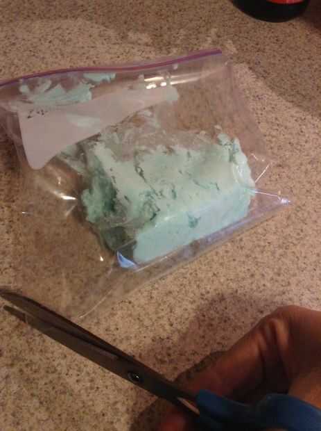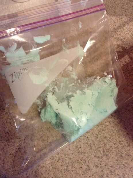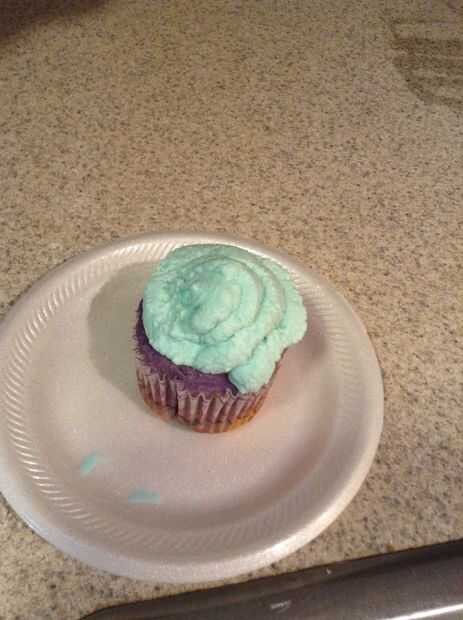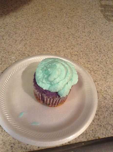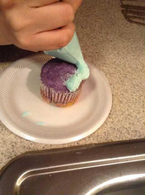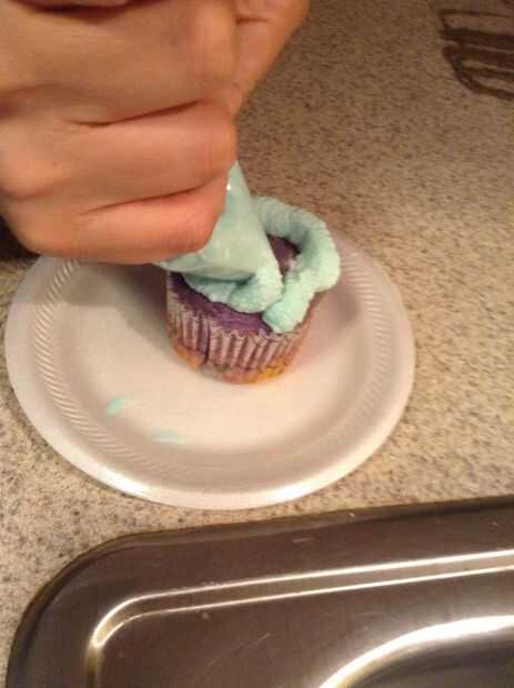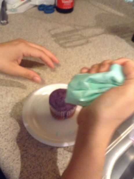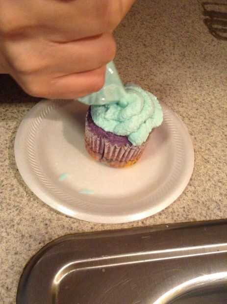 Usando una espátula de goma, coloque el el preparado helar dentro de una bolsa ziploc. Selle la bolsa y cortar una esquina con tijeras. Empezar por helar tuberías alrededor del borde exterior de la parte superior de la Magdalena y mover la bolsa Ziploc en un movimiento en espiral hacia adentro hasta terminar en el centro de la cupcake.