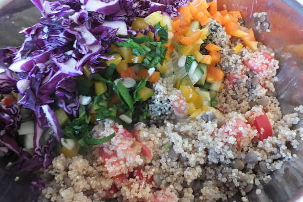 Mezclar la quinoa con 1 taza rallado lombarda, verduras picadas y aderezo.