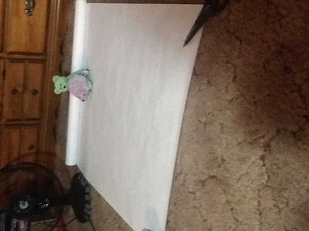 Usted quiere asegurarse de que el papel es más grande que el tamaño de una hoja. De esa manera usted puede envolver alrededor de la parte posterior de la hoja por lo que la cinta no muestra. Tuve que pesan por lo que te pude mostrar lo que parecía en comparación a la hoja, pero no estoy seguro si ayudado por Alex y las tijeras la cubierta un poco. Usted tiene que tener ese mismo tamaño de papel para cada lámina.