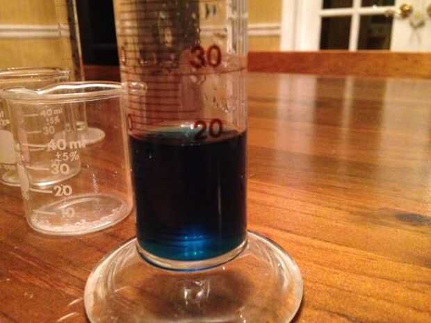6. usando la pipeta, cuidadosamente capa 20 mL del vaso 2 encima de los 20 mL de líquido de color azul que ya está en el graduado. Añadir la capa ejecutando lentamente la solución por el interior del cristal de la grad. No aplique la solución directamente en la solución en la parte inferior del cilindro.