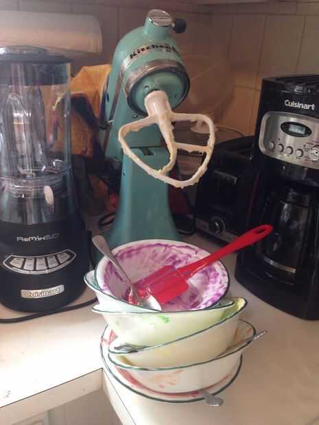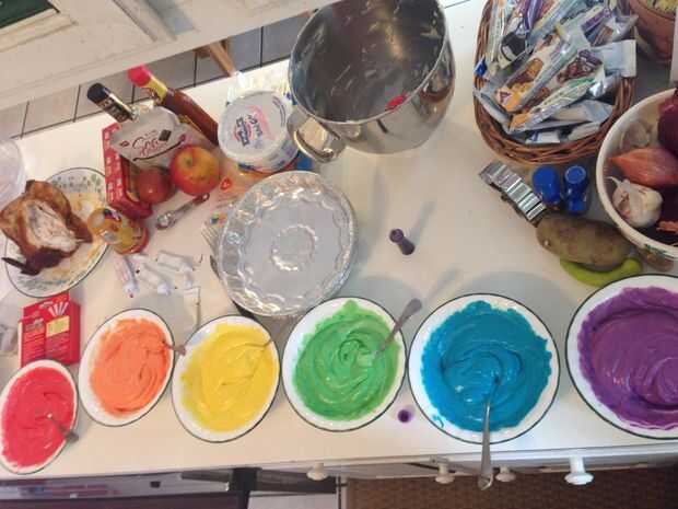 - Alimentos para colorear en los colores del arco iris. (He encontrado gel colorante en tubos y luego neón púrpura en forma líquida).