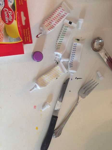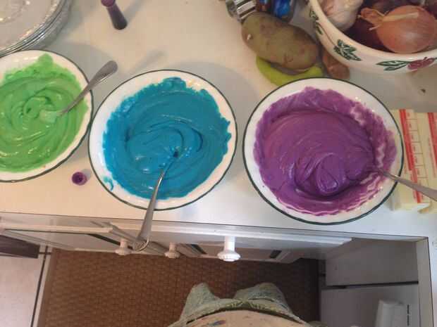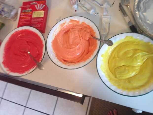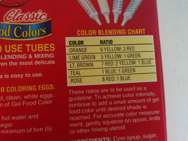 Usted puede hacer cualquier colores que usted quiere, pero elegí un arco iris completo. Rojo, amarillo, verde y azul son todos bastante fáciles. Tuve que utilizar un medio tubo para cada uno para conseguir los colores más brillantes, pero varían según qué tipo de colorante de alimento que tienen. Para hacer naranja necesitas acerca de una relación 6:2 de amarillo a rojo, que significaba para mí que apreté el amarillo durante tres segundos y el rojo para uno. Mezcla en un tono perfecto que no quería meterse con después.