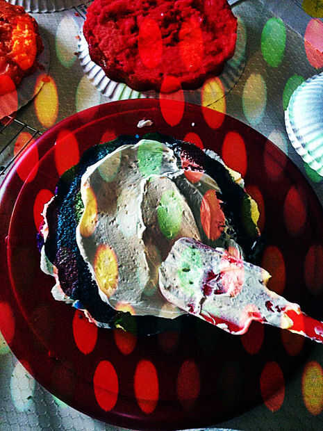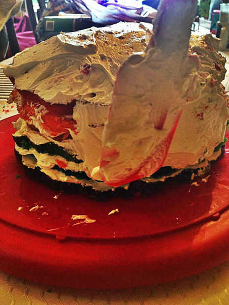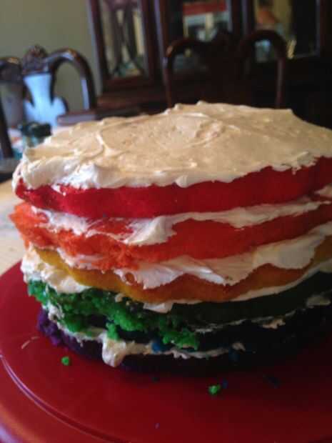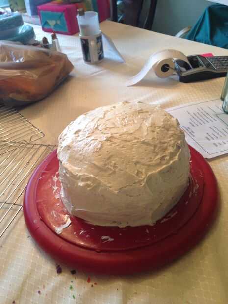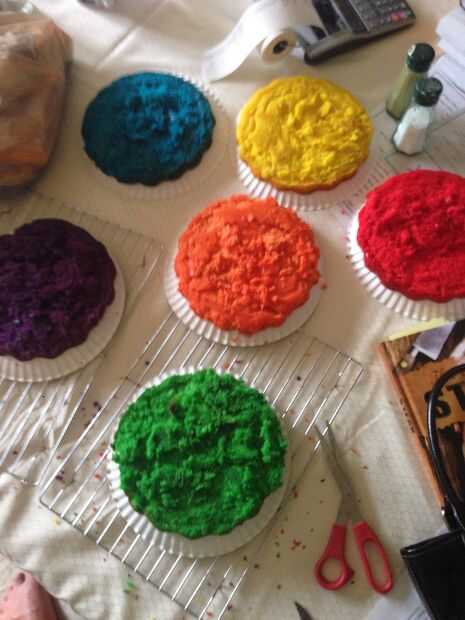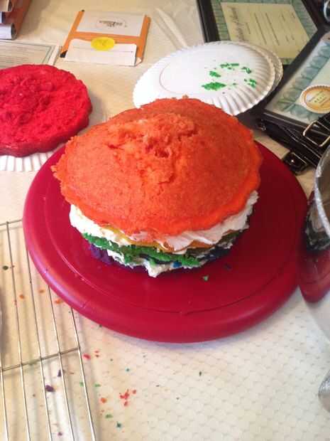 Comenzar con púrpura, una torta de la capa y luego aplique una capa delgada de medio de helar. Repito, en orden de marcha atrás-arco iris y luego el resto de la cubierta para cubrir el pastel. Usted podría hacer el aspecto exterior como el cielo o las nubes; He trabajado con Robot Dinosaurs en el espacio como el tema por petición ;)