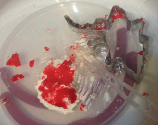 Después de dejar que sentarse fuera de la nevera para sobre una media-hora (crema fría es rock duro), coloreado el helar. Me goteó azul y teal de colorante de alimentos en los lados y se arremolinaba en añadir algunas velas plata intergalácticos y adorable dinos (especie de) la forma de una estrella.