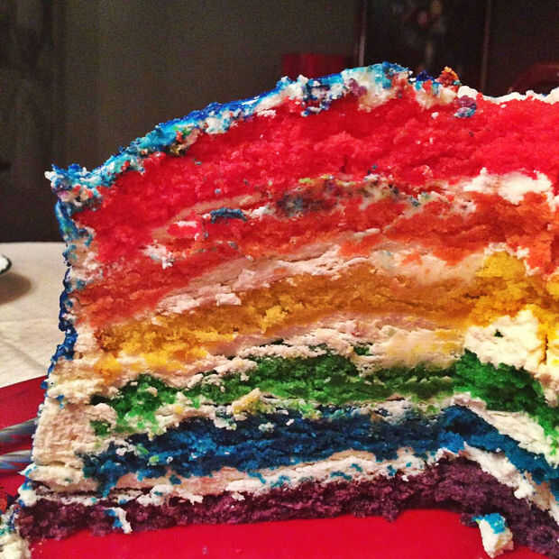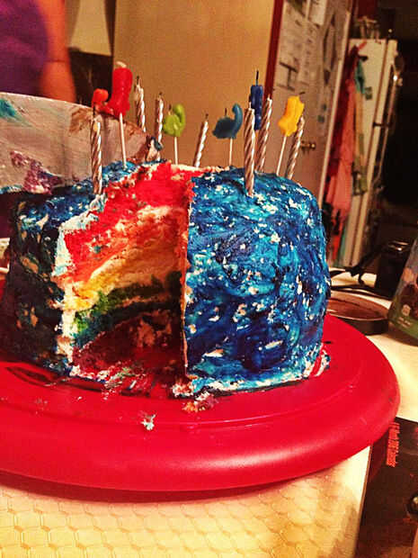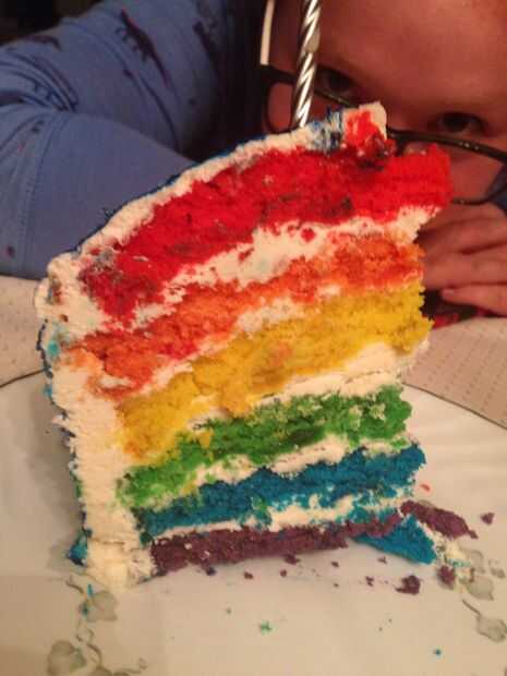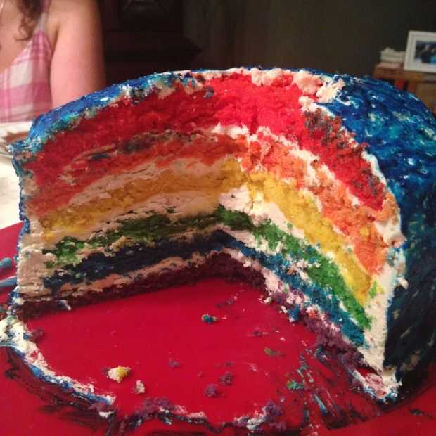Corte el glaseado con un cortador de galletas en el centro de la torta. Me imagino que podría hacer lo mismo con cualquier forma en los lados de la torta para darle ventana sneak peak del arco iris. Realmente lo hice porque mi supuesto pastel "práctico" al y sacó la mitad superior de mi pastel! La decoración era una especie de trabajo de reparación.