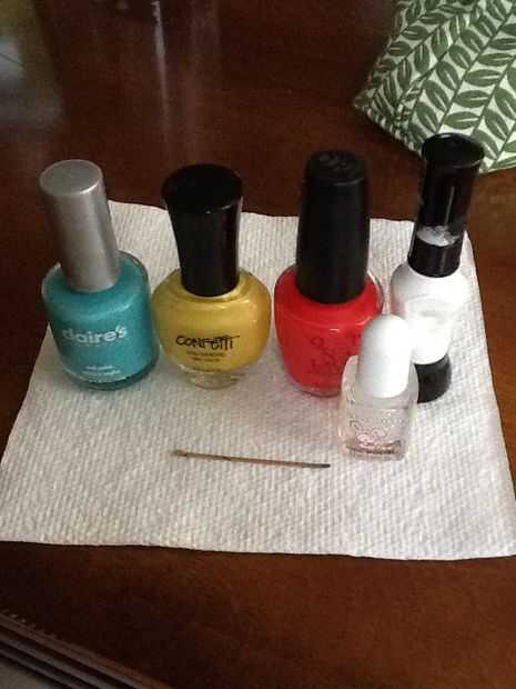 1) rojo polaco polaco 2) azul 3) amarillo Polaco 4) la mitad de una horquilla o punteado herramienta 5) brillante esmalte transparente (opcional) clavo 6) blanco bolígrafo pequeño o striper