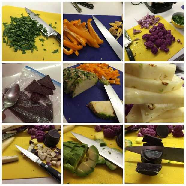 Picar todos los ingredientes a tu tamaño deseado! Esta parte es suya, pero encontramos que grandes trozos de salami, pimiento y coliflor eran más fáciles trabajar con y crearon el mejor efecto de color. Asegúrese de cortar los tallos enteros de la coliflor y mantener sólo las cabezas realmente vibrantes.