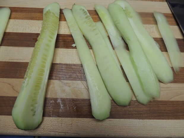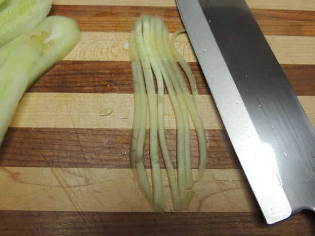 Tomar el pepino y pélalo. Hacer 1-2 rebanadas a lo largo del lado derecho del pepino. Desea lonchas finas se puede Juliana. Asegúrese de no cortar demasiado profundo, no desea que las semillas. Una vez las semillas, girar el pepino por lo que es el lado plano hacia abajo y repita. Seguir haciendo esto hasta que tenga unos 8 rodajas dejando un centro cuadrado lleno de semillas restantes.
