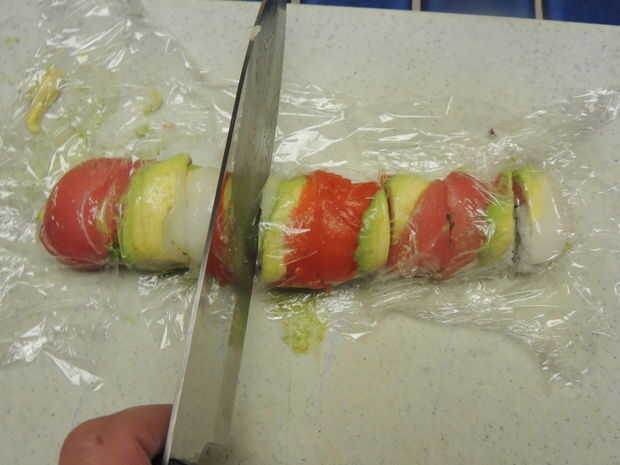 Dejando la envoltura plástica en rebanada el rollo por la mitad. Uso de las mismas, una corte método como los peces, a partir de la base de la cuchilla y el dibujo hacia usted terminar el corte con la punta del cuchillo. Limpie la cuchilla con un paño húmedo y cortar cada mitad por la mitad otra vez para formar 4 secciones, pasando la hoja entre las rodajas. Cortar cada una de las 4 secciones a la mitad una vez más dando como resultado 8, de igual tamaño piezas. Asegúrese de limpiar el cuchillo entre cada corte con un paño húmedo. El arroz es super pegajoso y no se obtendrá rodajas de bonitos si no limpiar y humedecer la hoja. Repita el proceso de corte con rodillos adicionales.
