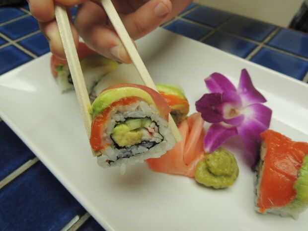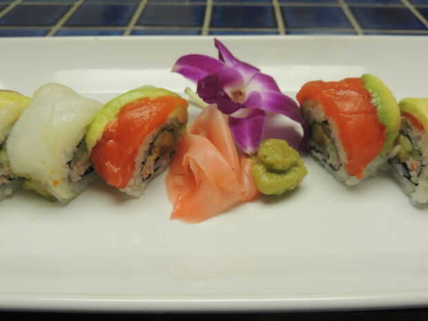Retire el envoltorio plástico y coloca un rollo de rodajas en una placa rectangular o varios rollos en una placa grande. Quiere escalonar ligeramente las rebanadas para mostrar su arco iris topping y exponer el relleno hermoso. Decorar con el jengibre conservado en vinagre, pasta de wasabi y una flor comestible. Servir con salsa de soja y asegúrese de disfrutar! Te lo mereces después de todo ese trabajo tedioso! Una vez que esa primera pieza golpea la boca sabes que valió la pena todo! Las bombas de Sake que venga!