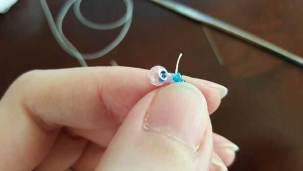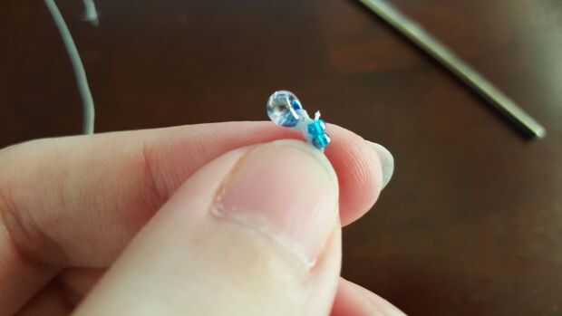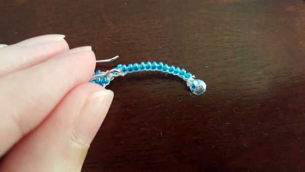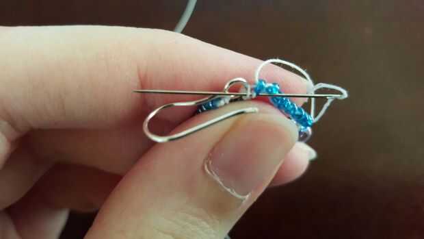 - Pase la aguja a través de las cuentas para arriba hacia el gancho del pendiente y tire a través suavemente.