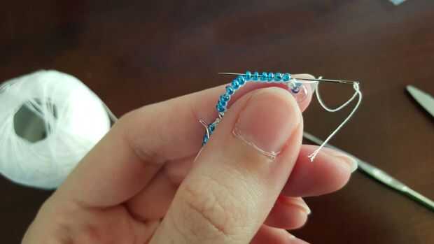 - Inserte la aguja en los puntos el caída del grano de conexión con el resto de la cadena y nudo realizado anteriormente.