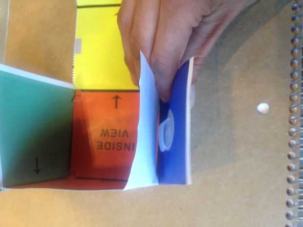 Doblar el rectángulo rojo en la mitad, por lo que son los cuadrados verdes en el interior de los cuadrados azules. Aplique presión para que se peguen la cinta sobre los cuadrados azules a la parte posterior de los cuadrados verdes.