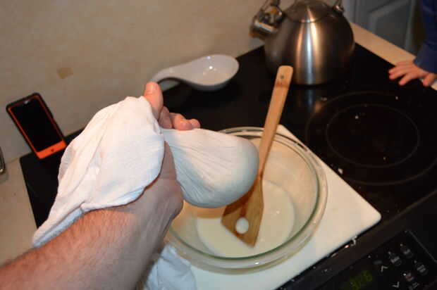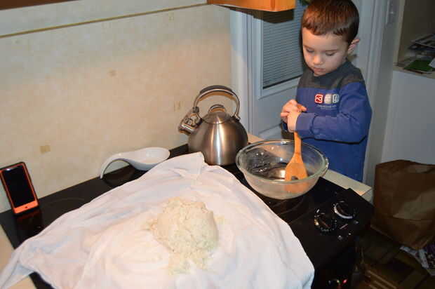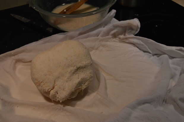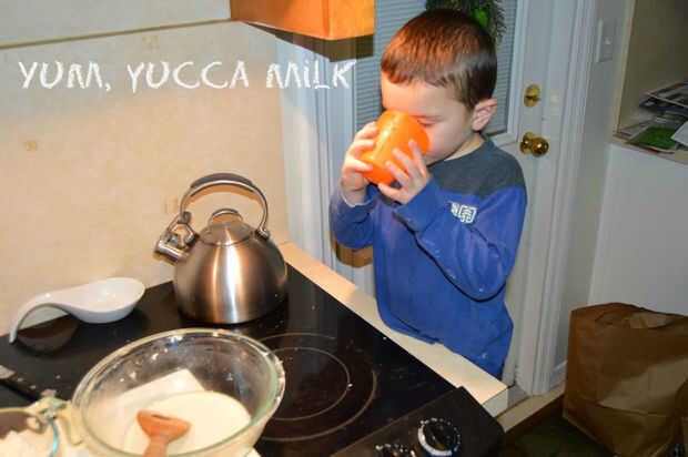 Utilizando un rallador de queso, ralla la raíz de yuca y colóquela en un paño de queso. Envuelva la raíz de yuca rallada en el paño y drenar el exceso de líquido. Nota divertida, mi hijo querido dink la "leche" de la yuca... Pues creo que las fotos lo dicen todo.