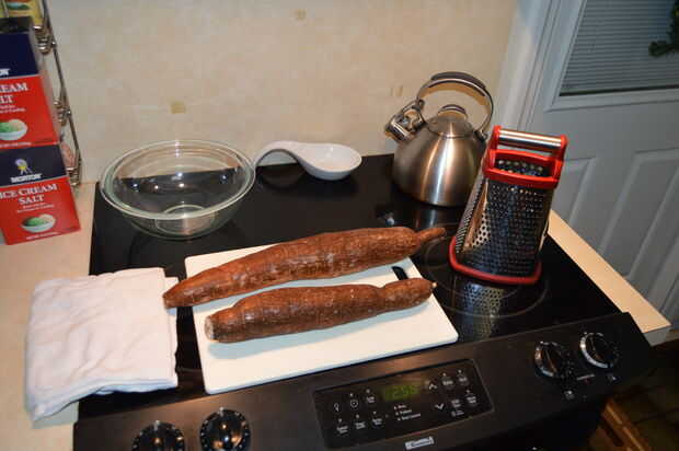 1. Dos raíces de yuca grande rallado y drenado a través de un paño de queso rinde aproximadamente 1 lb