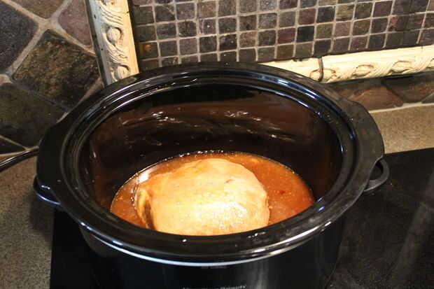 Vierta 1/2 taza de salsa de barbacoa en la Crockpot