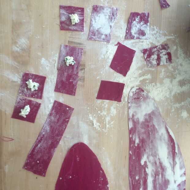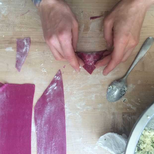 En este punto, usted tiene opciones. Formas de pasta rellenos de ravioles, tortelli, pansotti o cualquier otro. Aquí, cortar igual de pasta, poner una cucharadita de relleno en el centro y doblado para hacer un triángulo. Entonces, pat y los selló. siguiente paso es conectar los dos extremos lejos girando el lado relleno alrededor de tu dedo para formar como un pequeño sombrero. Asegúrese de que la masa no seque demasiado, de lo contrario lo cappelletti no cierra bien.
