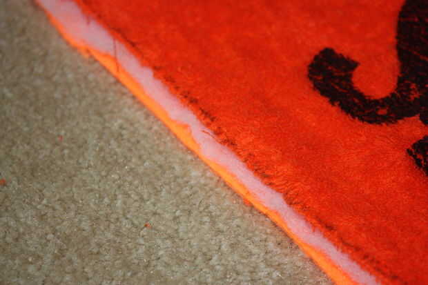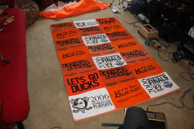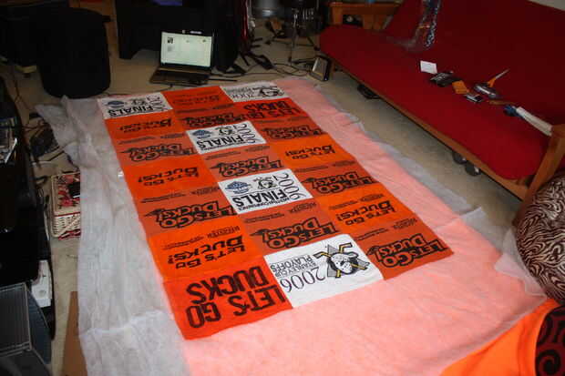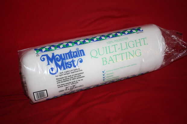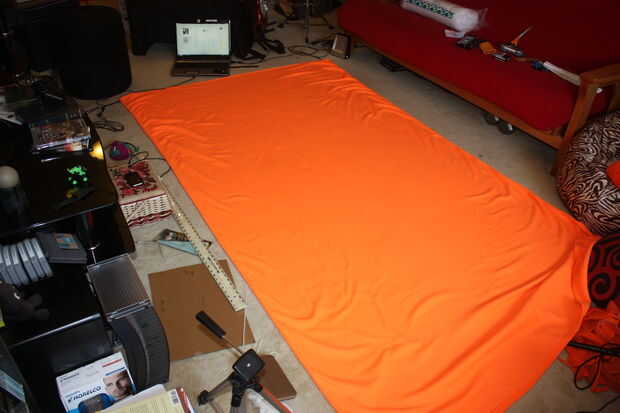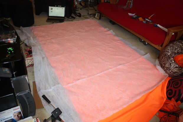 Finalmente, llega el momento a algunos de los otros materiales. Comience disponiendo el material de apoyo para su edredón. Elegí una lana naranja brillante estupendo (yo habría elegido negro, pero esto estaba a la venta, y yo soy una pobre estudiante). A continuación, colocar la guata encima de la capa de apoyo. Es importante mantener todo lo plano y liso.