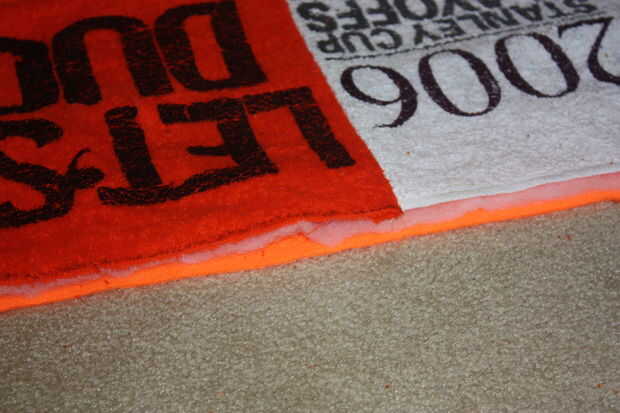 Una vez que aquellos se suavizan todos hacia fuera y plana, nos podemos colocar la capa superior "rally toalla". Entonces necesitará coge tus tijeras de tela y cortar todo, seguimiento de la capa de la "toalla de rally".