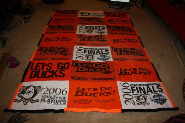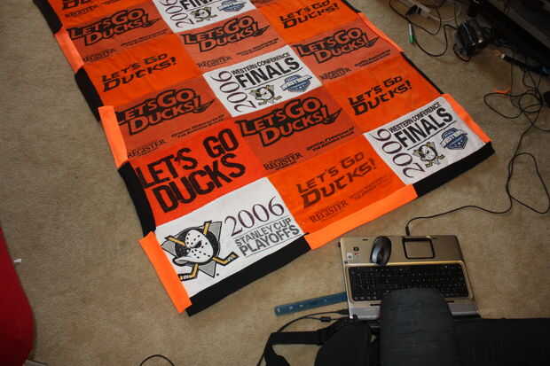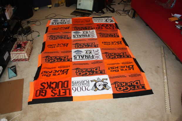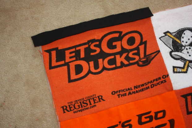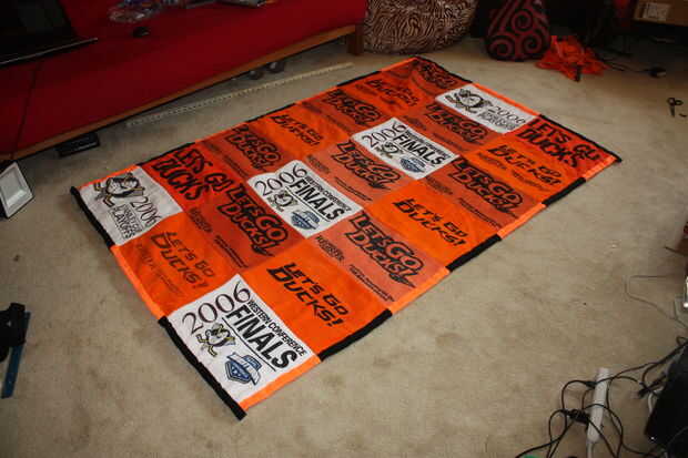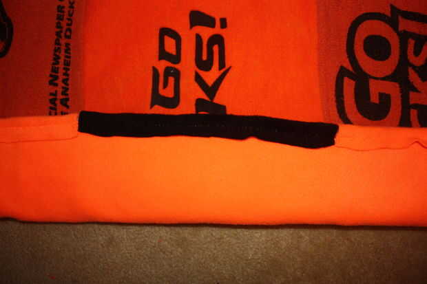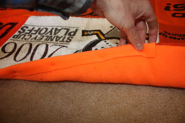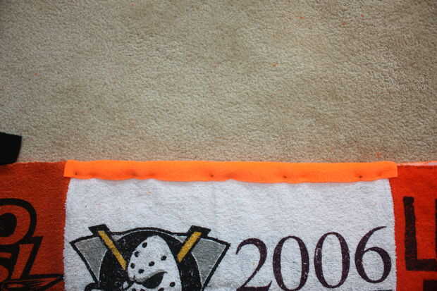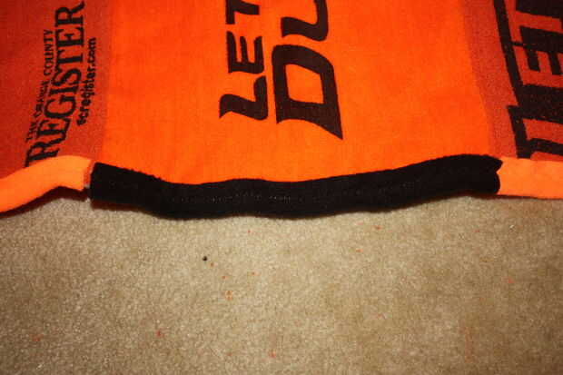 Alfileres y coser el ribete son una tarea mucho más difícil. Empecé a prendiendo las piezas naranja en primer lugar, por lo que el negro se superpondría les. Al fijar el borde, usted necesita para asegurarse de que cada pieza es uniforme en ambos lados y también Asegúrese de que las capas del paño grueso y suave, bateo y toalla, se incluyen. Tómese su tiempo fijando el borde y luego cuando estás seguro que todo es juntos correctamente, lo cosa.