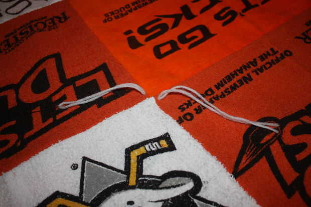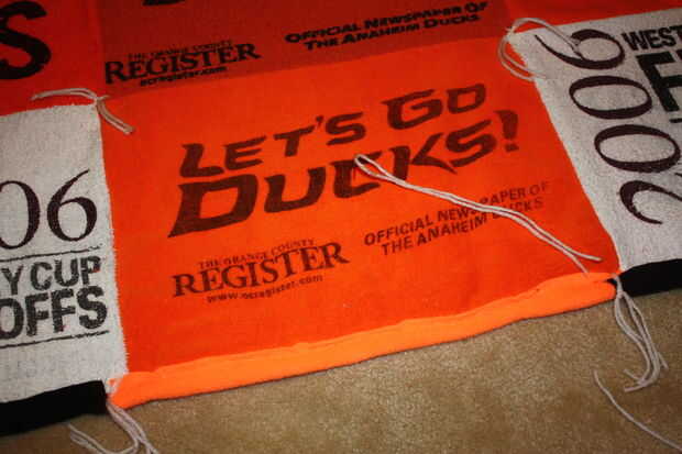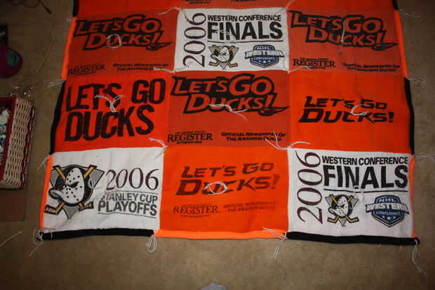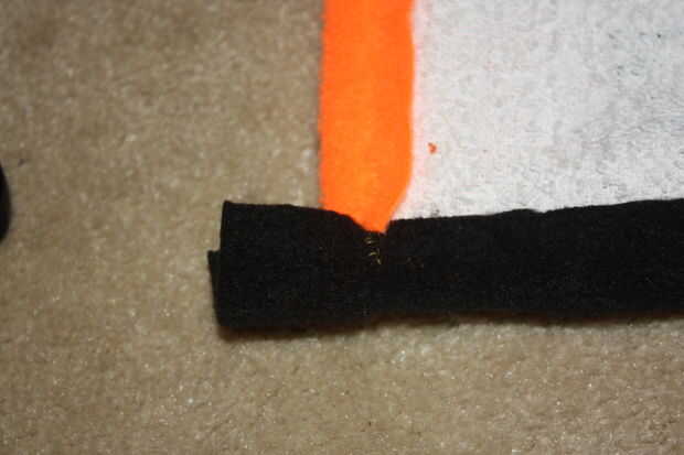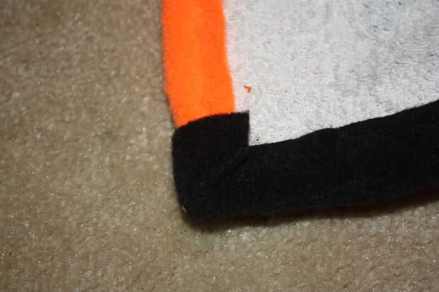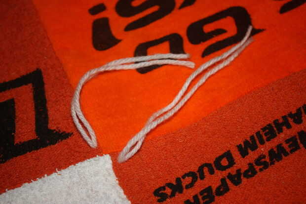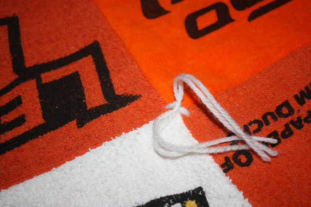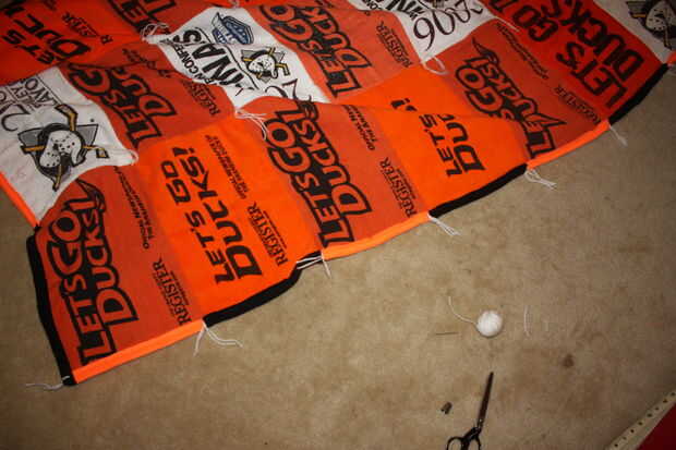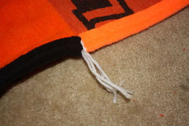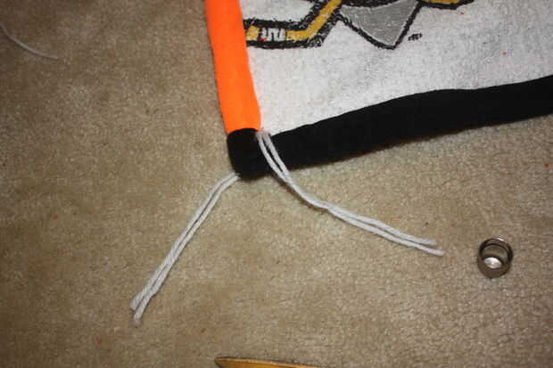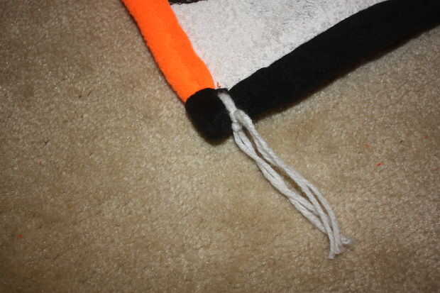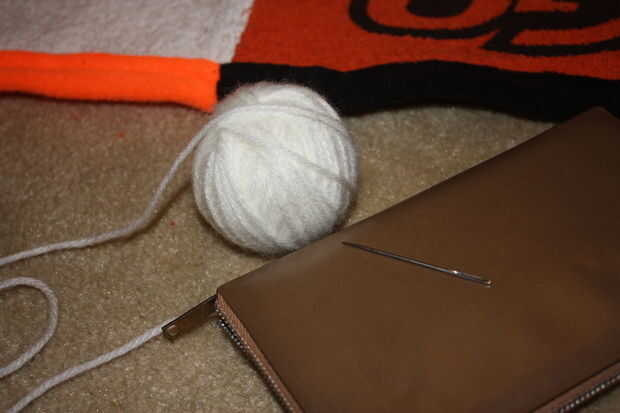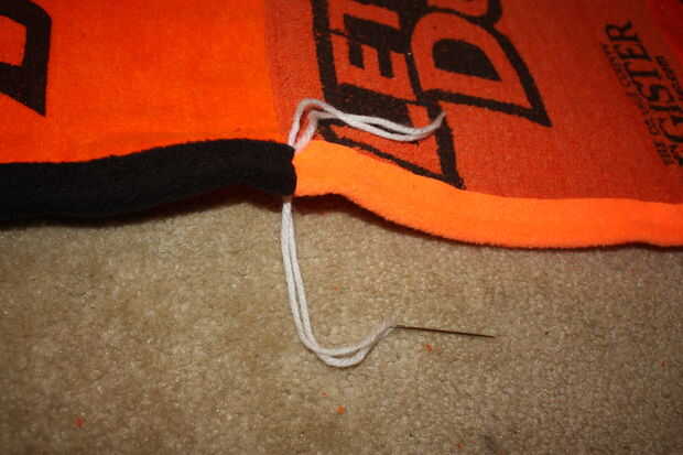 El embalaje del bateo sugiere que amarre o tejido de la tela a no más de 5" intervalos, pero sentí que sería demasiado y le quita la mirada. Me decidí a hacer uno en cada esquina de una toalla y luego un amarre en medio. Utilicé un hilo de aguja e hilo para hacer todos los amarres.