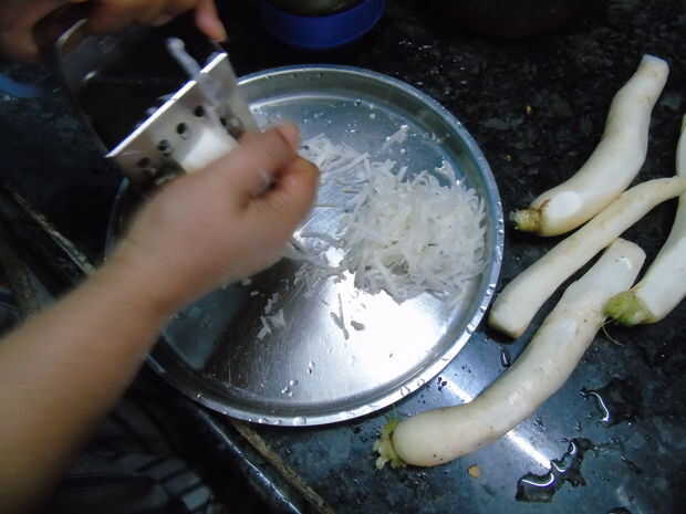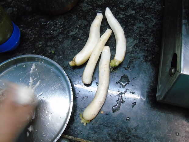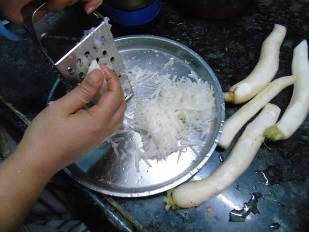 Lavar y rallar rojizo en tiras largas. Manténgalo a un lado.