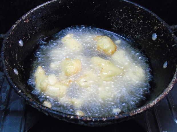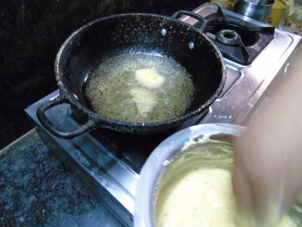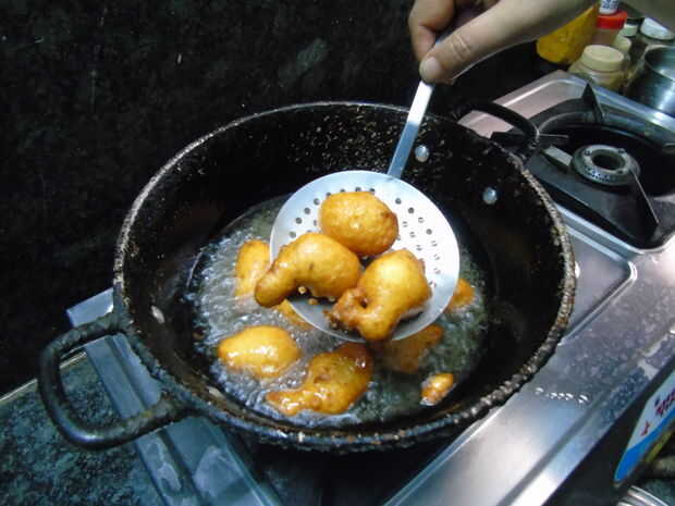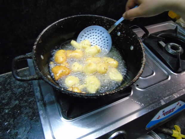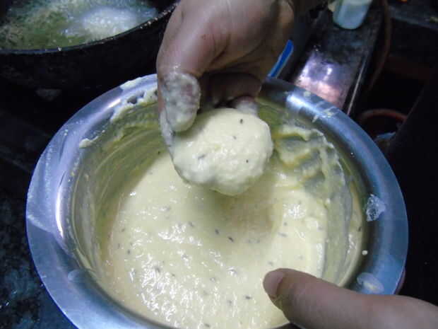 Una vez que el aceite se calienta tomar poca masa en los dedos como se muestra en la imagen o una cucharadita y poner en el wok... Puesto 5-8 de ellos en el wok y baje el fuego. Después de dar vuelta una vez aumentar el calor y cuando se vuelven rosadas los saca.
