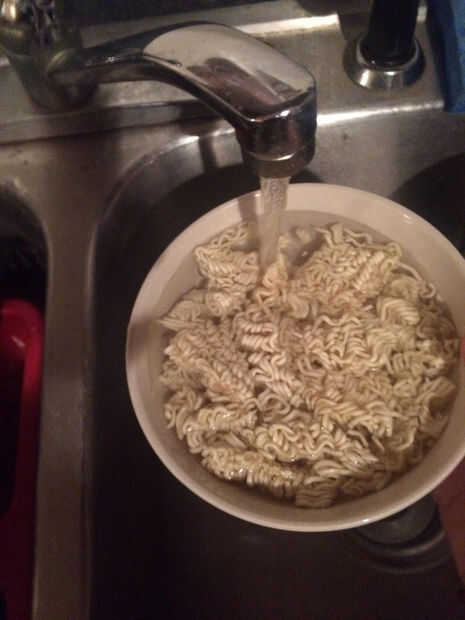 2. Poner los fideos en un tazón microondas y cubrir con agua. Agregue suficiente agua para cubrir los fideos; generalmente se necesita 1 a 2 tazas de agua.