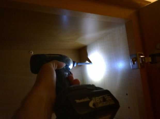 Al cortar la rama estaba seguro que cortar aproximadamente 1/16 de pulgada de largo por lo que pude la cuña entre los gabinetes, de esta manera podría permanecer en el lugar hasta que pude obtener tornillos en cada extremo. Estos gabinetes tenían las paredes laterales de 1/4 de pulgada usé tornillos largos de 3/4 de pulgada. Fui capaz de atornillar a través de los gabinetes desde el interior directamente en la sucursal asegurándolo en lugar.