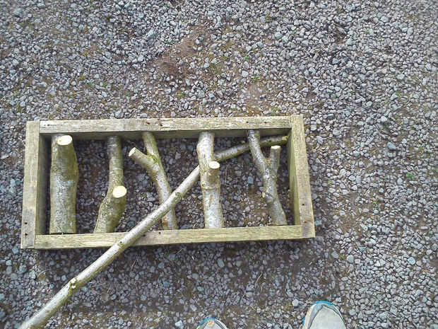 este árbol de Navidad de madera caseros fue iniciado por un edificio de una madera de base y apoyo de 1 1/2" por 5' cilíndrica poste de madera, luego cada 2 x 4 se ha reducido a varias longitudes. Un agujero se corta al final de cada pieza se deslice