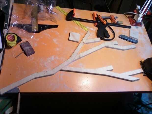 Después dibujándola, cuidadosamente corte la rama. He utilizado una sierra de calar portátil, que acelera enormemente el proceso. Lijar toda la rama con 120 arena y papel de lija de grano 220 entonces, para que sea suave al tacto, sin olvidar a los bordes de arena.