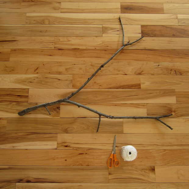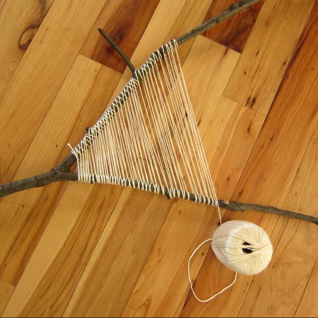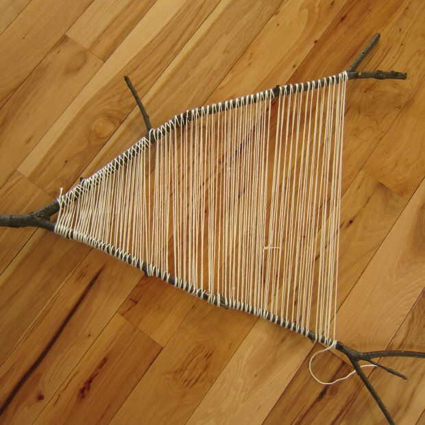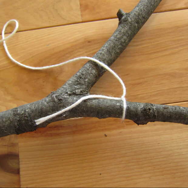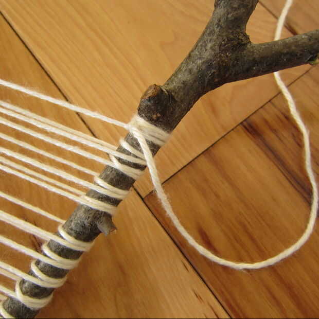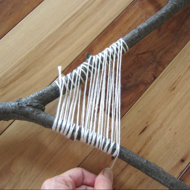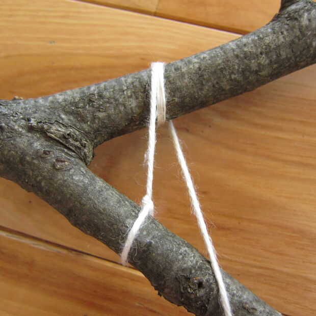 Atar el extremo del hilo en el extremo cerrado de la 'V' de la rama inferior. Estirarlo hasta el rama superior y Envuélvala alrededor de una vez antes de estirar a la rama (arriba) enfrente asegurándose de mantener la burla del hilado.