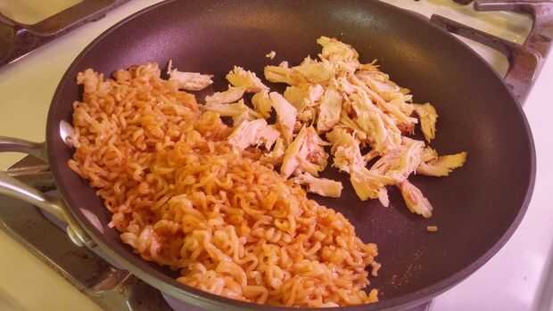 (Después de mi pollo cocinado, I se trasladó la mezcla a un lado y revuelto mis huevos en el espacio abierto e incorporados en los fideos también.)