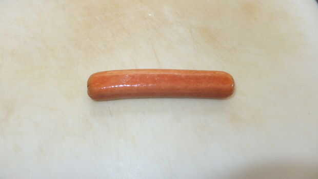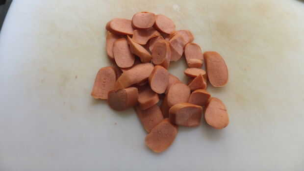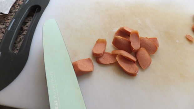 Bien, ahora que las salchichas. Obtén dos enlaces y slcie les diagnolly por lo creat un óvalo. Theis ofrece las salchichas una mejor forma cuando se cocinan, y Super Ramen requiere todo sea mejor. Al final usted tendrá un montón de salchichas en rodajas, algunas bonitas y otras no tanto.