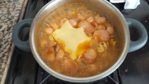 Baja otra vez el calor de la llama a medio y añadir el queso en la parte superior. Usted puede preguntar, ¿por qué hay marcas de mordedura en el queso? Bueno, siempre encontré una loncha entera de queso demasiado abrumador en el Ramen, por lo que generalmente solo comer la mitad de ella primero luego poner el resto en. Si tuviera cebollas verdes, yo pero en tol trozos pequeños y añadir al principio. Retirar la olla del fuego, revolver para conseguir el queso mezcla y disfrutar!!