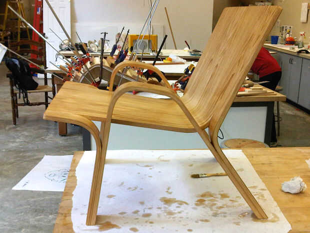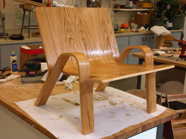 BFA mi tesis explora las maneras en tecnologías de fabricación digital pueden ayudar a mano de los artesanos.  Esta mecedora de madera contrachapada doblada fue esbozado inicialmente en Rhino3D, de que era capaz de fabricar un molde de prensa que ha