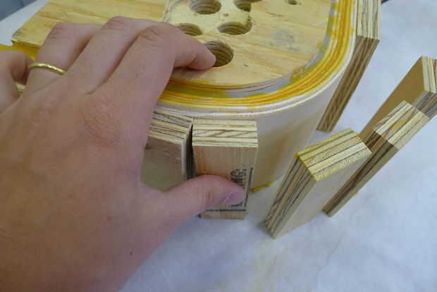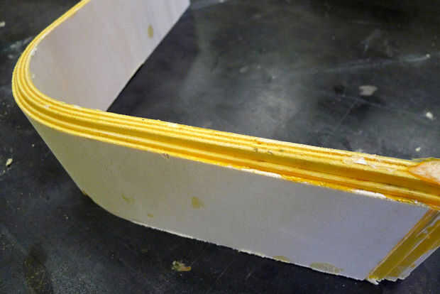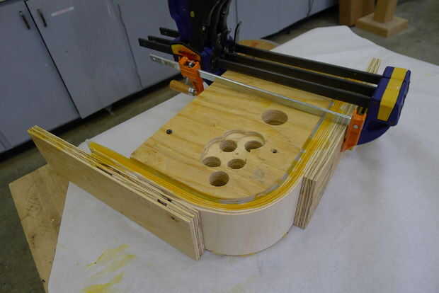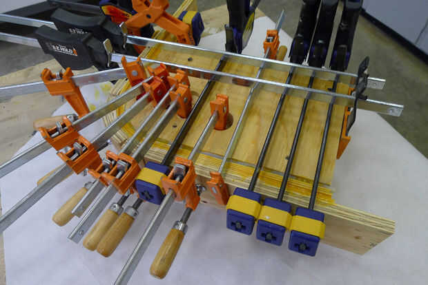 En total utilizaron 5 tiras de lo 3 mm curvada y utiliza pegamento para madera regular y lo dejó por 24 horas secar. Fue una fácil y corta la curva de 90 grados. Como un Consejo: pongo una pieza delgada de plástico sobre el molde por dos importantes razones, en primer lugar, hacer una suave superficie para doblar y en segundo lugar, para que sea más fácil desmoldar. También como fue mi primera curva usaba 13 pinzas pero después de eso me di cuenta que podía haber probablemente utilizado 8 abrazaderas.