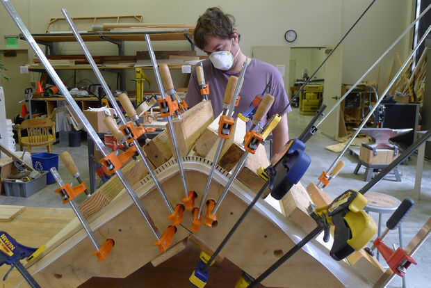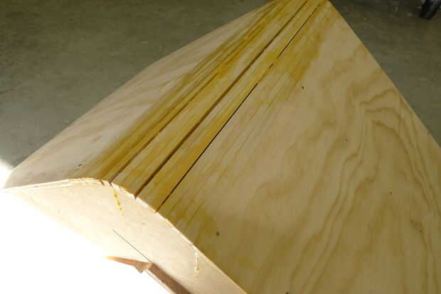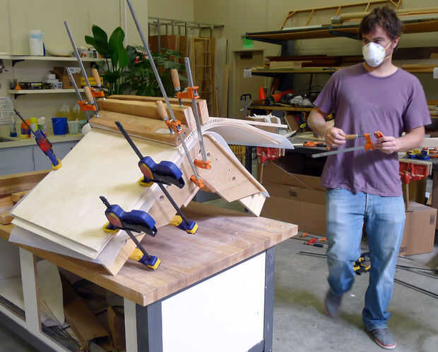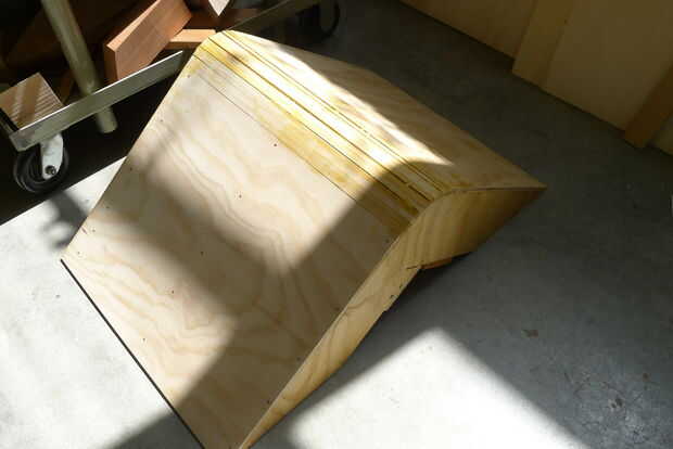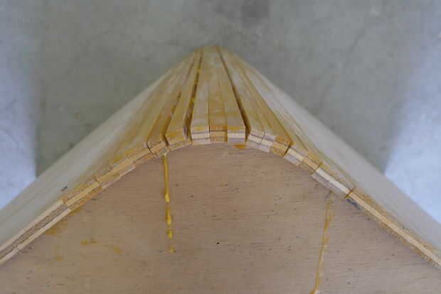 Haciendo el molde del asiento fue sin duda más difícil. Cortar unas tiras de madera sobre la curva y luego puse unas maderas puddy y arena hacia abajo suavemente.  Como un molde femenino iba a ser complicado que kerfed un pedazo de ¾ fina madera contrachapada (sólo la parte del radio) hasta la última capa, les espaciado uniformemente 7 mm unos de otros.  Esto creó un pedazo flexible de madera que fácilmente podría utilizar como un molde hembra.  Para fijar el asiento al molde tenía que pedir a mi esposa ayuda pegado las superficies de la madera y también la sujeción del otro extremo.