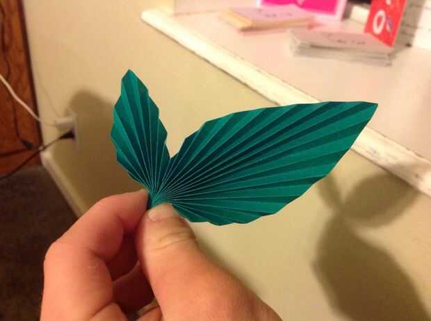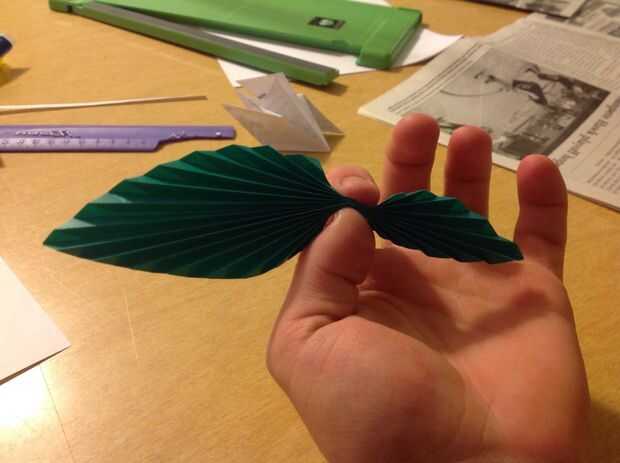Pellizcar entre el medio y un lado, pero un poco más cerca de la media. Este será el tamaño de sus hojas para que medida basado en cómo usted quisiera que terminan. doblar por la mitad derecha donde pellizca y pliegue firmemente. Esto te dará dos hojas de diferentes tamaños. poner pegamento caliente en el pliegue para mantenerlo cómo quieres entonces póngala a un lado.