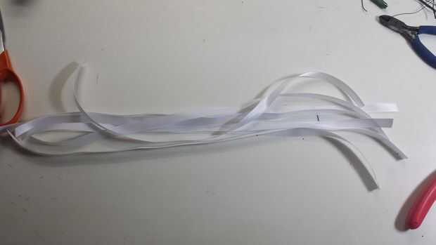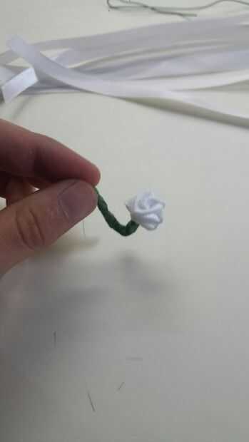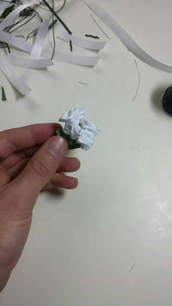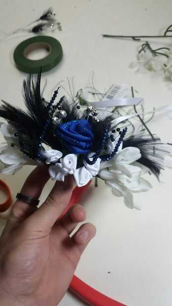 La última cosa para hacer para el ramillete son estas flores de cinta pequeño. Ayudarán a ocultar el resto de la cinta floristas para que se vea mejor. Hacer 6 o más para cada lado del ramillete. Hace la misma manera como las grandes flores de color azul, pero con la cinta más delgada. Incluso con mis manos pequeñas no pude conseguir a floristas cinta detrás de las flores para pegarlas al centro de la mesa, así que tuve que utilizar el alambre de floristería. Envuelva el cable alrededor de la pieza central y torcerlo luego alicate se tuerza como apretado como usted necesita. Cortar el alambre torcido y doblar para que se puede dañar la muñeca de portadores. La última cosa que necesita hacer es poner la correa de muñeca en! Puede que necesite utilizar alambre porque es metal muy maleable y puede caerse si no asegurarla correcta.