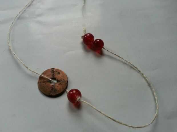 Para la claqueta usé una cadena más larga. Insertada 2 granos en un lado y ató un nudo en ese extremo para que no salgan las cuentas. Hacer otro nudo arriba 2 granos, inserta un cordón y un anillo de metal plana. Midió la longitud de la cadena y se aseguró que el anillo metálico toque los tubos de campana. Esto es realmente importante, asegúrese de medir la cadena o el hilo de rosca de los tubos de campana y el badajo, la chapaleta deberá tocar los tubos de la campana.