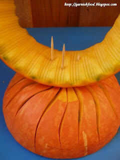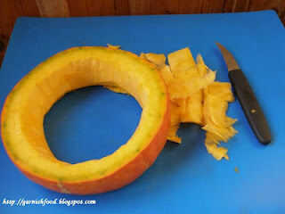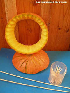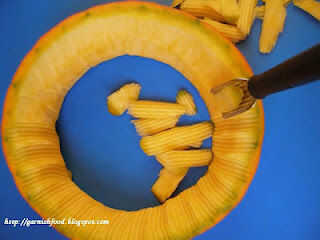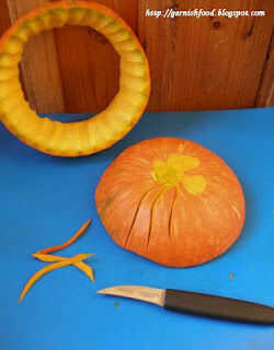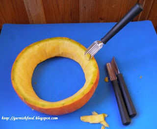 3. al retirar la calabaza carne obtendrá un anillo de calabaza. Decorar con el cuchillo de forma de U o V.