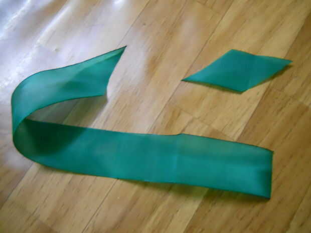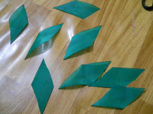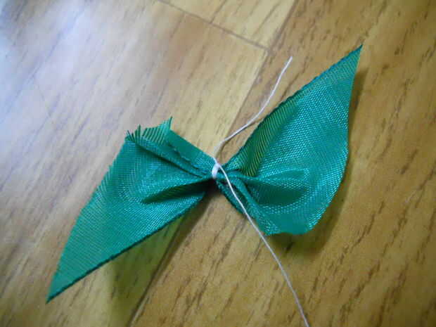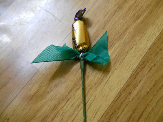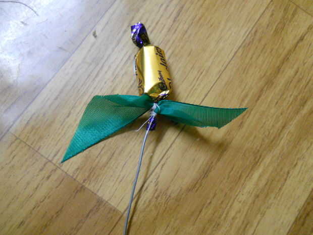 cortó cintas verdes en forma de diamante (tarjetas) tomar lados opuestos del diamante en forma de cinta y atarla con hilo Ahora tome un pedazo de alambre y coloque un caramelo y hojas así formadas con hilo de rosca de la cinta verde cinta en el alambre