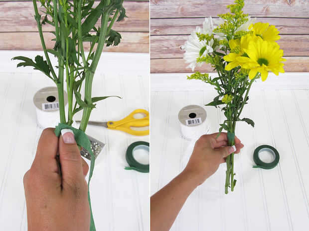 Fije la primera capa de flores con cinta floral. Envuelva la cinta alrededor de lo suficiente para que las flores no están sueltas. Puede cortar o rasgar la cinta y permitir que el extremo a se adhieren a la cinta en los tallos.