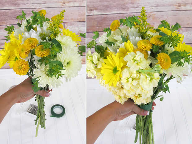 Empezar a construir su ramo, cada vez que agrega una capa de flores, seguros que con la cinta floral. Asegúrese de que usted gire las flores para crear un ramo colorido equilibrado!