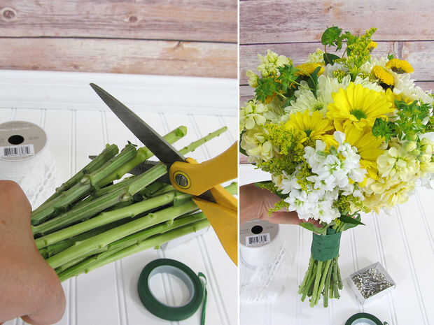 Una vez que ha construido un ramo bastante grande y está satisfecho con la forma, cortar todos los tallos a la misma longitud.