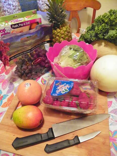Piña, melón, melón, uvas, fresas, pomelo, cabeza de lechuga iceberg, col rizada. Usted también necesitará una tabla de cortar, cuchillo de cocina, cuchillo y palillos de madera. Tenía un kit de corte de fruta hecho para el que tiene galleta cortador tipo formas de corazón, flor, círculo... pero esto no es absolutamente necesario. Usted necesitará un contenedor para organizar todo, usé un cubo de plástico rosa. Si decides hacer un ramo más pequeño, un florero funcionan bien.