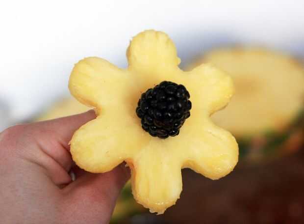 Para hacer la flor, había ensartado en el centro de la piña y usa un blackberry para el centro. Un consejito: purga de la Mora. La próxima vez usaré una bola de melón.