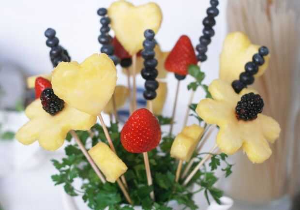 He hecho palos de arándanos para tratar de emular a Jacinto. Eran deliciosos. También he añadido algunos Crescent de melón y tallos de zarzamora para llenar el arreglo. Por último, he añadido ramitas de perejil para rellenar el espacio entre los pinchos.